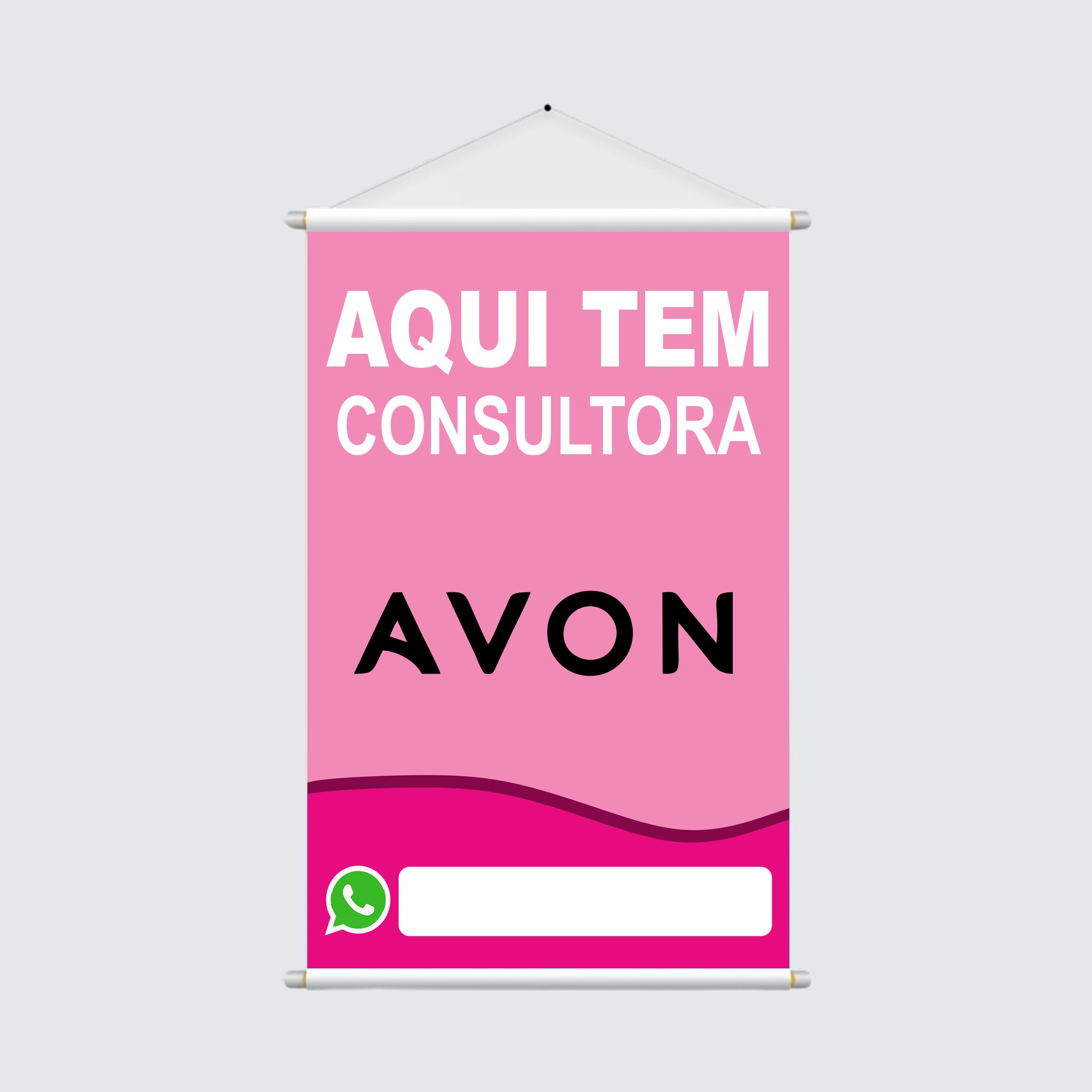 Este Banner Vertical de Divulgação é a ferramenta de marketing perfeita para qualquer revendedora ou consultora que deseja atrair clientes para a marca AVON. Com a cor rosa, icônica da marca de cosméticos, e uma mensagem direta ("AQUI TEM CONSULTORA AVON"), ele sinaliza de forma clara onde o cliente pode encontrar os produtos desejados.