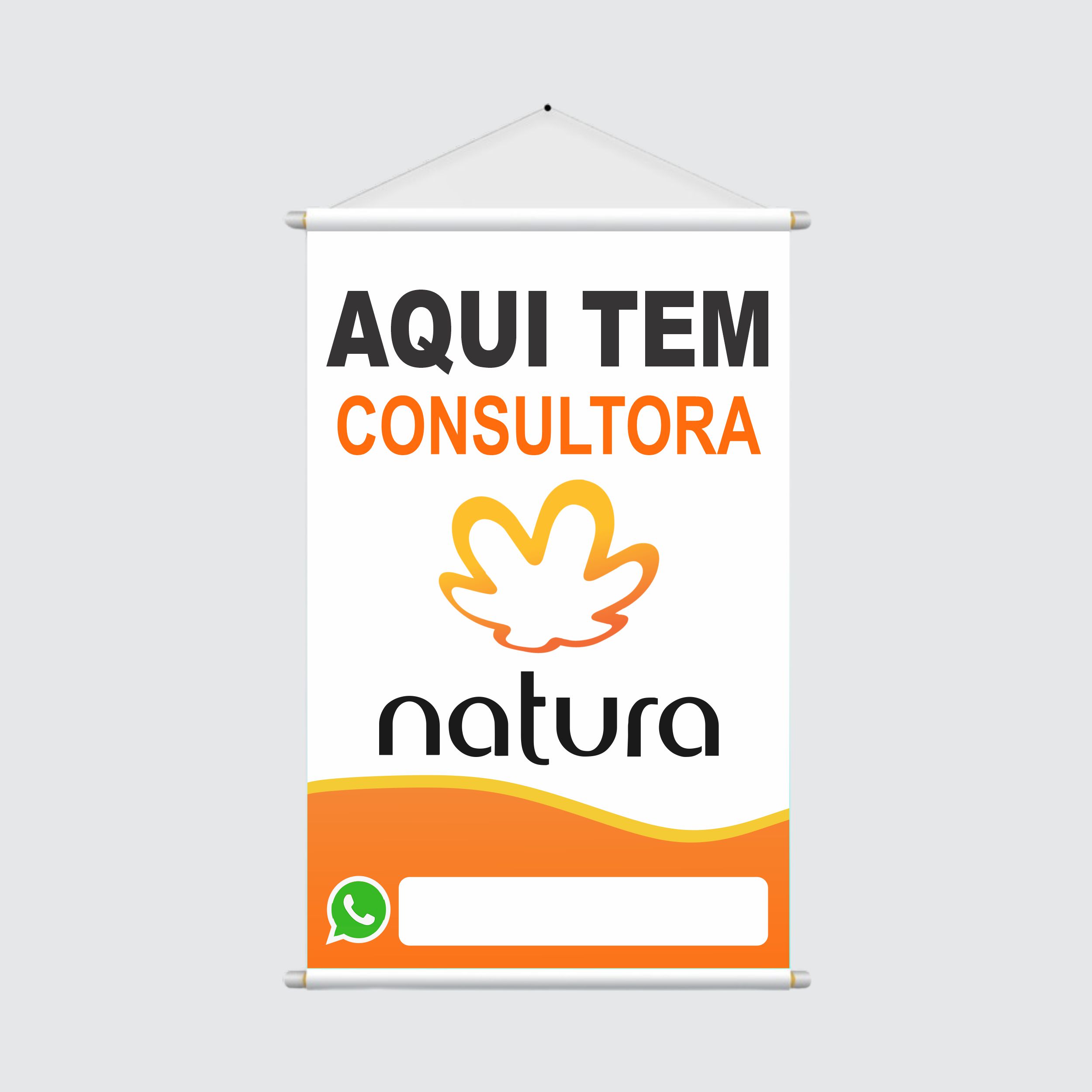 Este Banner Vertical de Divulgação é a ferramenta de marketing visual ideal para qualquer revendedora ou consultora que deseja maximizar a visibilidade da marca NATURA e atrair clientes. Com um fundo branco e a utilização da cor laranja, associada à identidade da marca e à natureza, ele comunica de forma elegante e clara: "AQUI TEM CONSULTORA NATURA".