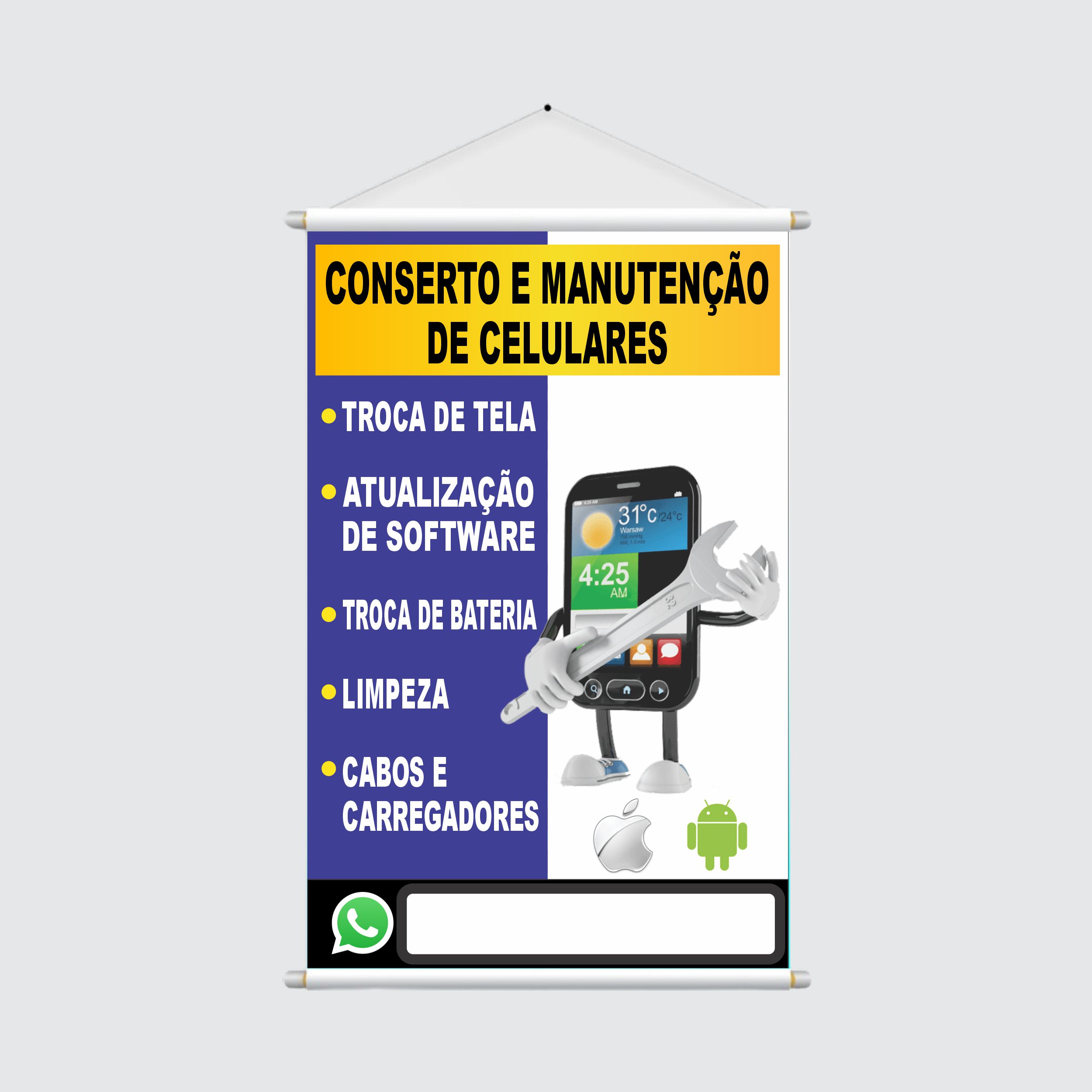 Este Banner Vertical de Divulgação é a ferramenta essencial para qualquer loja de assistência técnica de celulares e tablets. Com um design profissional e chamativo (combinação de amarelo e azul/roxo), ele lista claramente os serviços mais procurados, atraindo clientes que precisam de reparos rápidos e confiáveis.