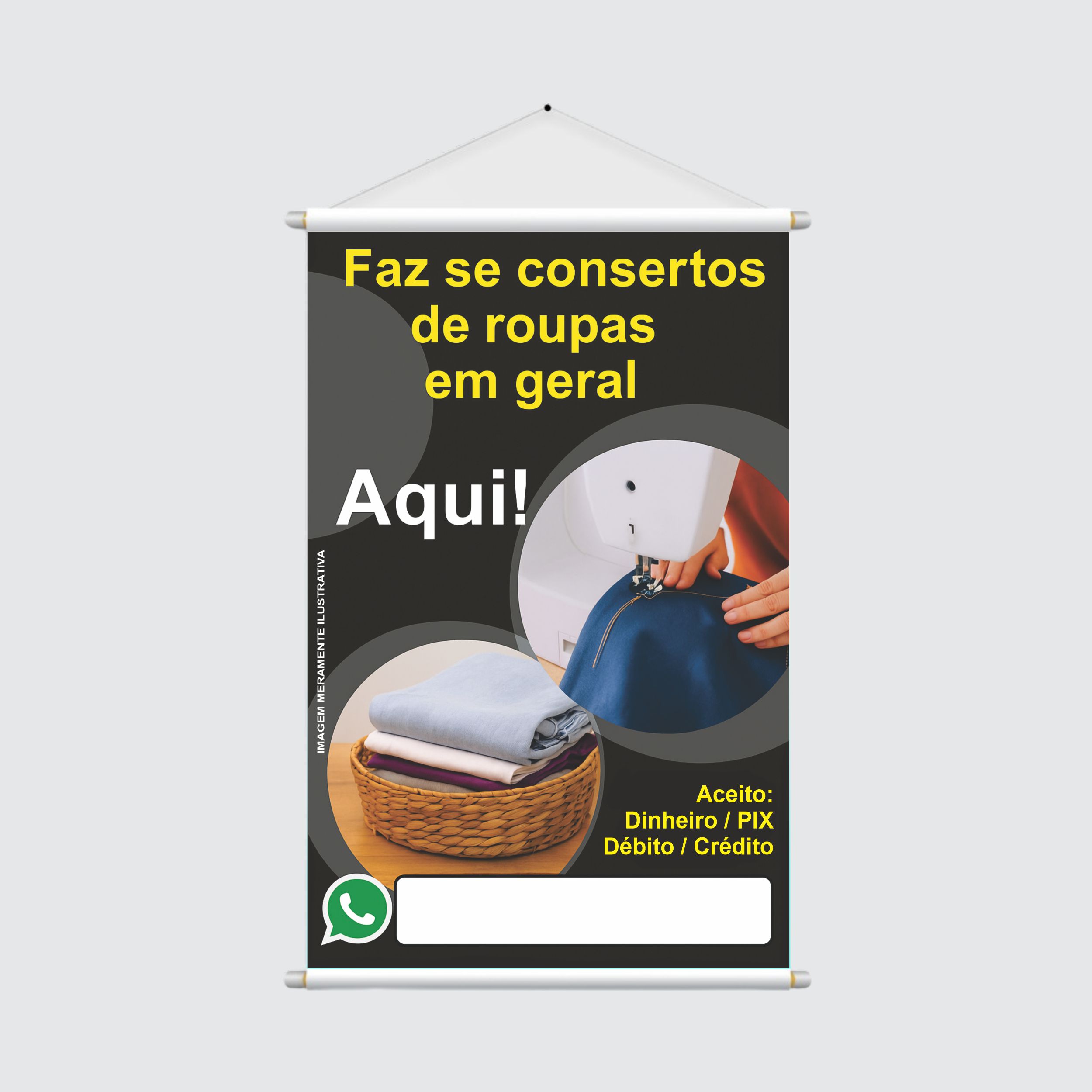 Este Banner Vertical de Divulgação é o item essencial para qualquer costureira, alfaiate, ateliê ou loja que ofereça serviços de reparos e ajustes em peças de vestuário. Com uma comunicação clara e direta ("Faz se consertos de roupas em geral AQUI!"), ele atrai clientes que buscam soluções rápidas e profissionais para suas roupas.